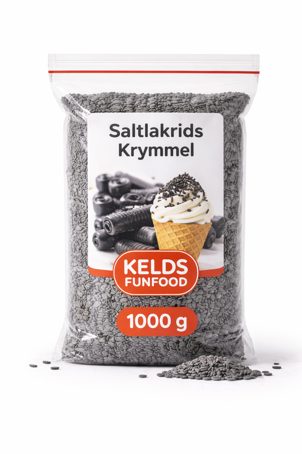 Saltlakrids Krymmel er sprøde, små lakridsstykker med karakteristisk saltet smag, perfekt som topping på softice, is, milkshakes eller desserter. Den fyldige lakridssmag og knasende tekstur gør det til et populært valg hos både børn og voksne, som ønsker en anderledes og spændende finish på deres dessert.