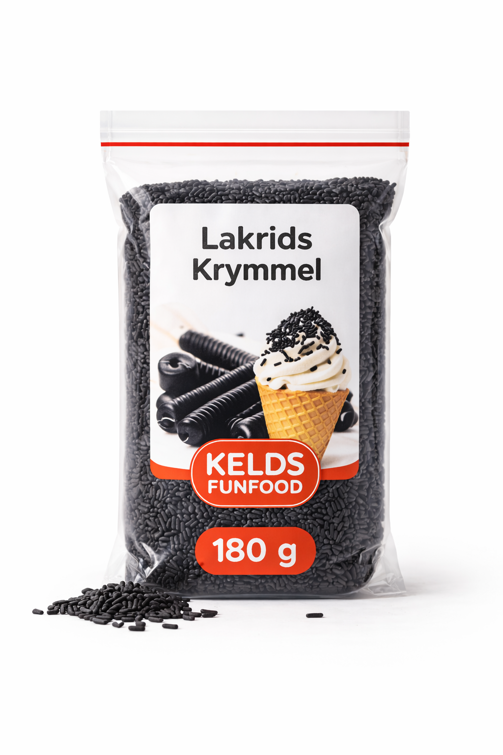 Lakrids Krymmel består af små, sprøde lakridsstykker med en intens og karakteristisk smag, perfekt som topping på softice, is, milkshakes eller desserter. Den knasende tekstur og fyldige lakridssmag gør krymmellet populært hos både børn og voksne, og det tilføjer både smag og visuel effekt til desserter.