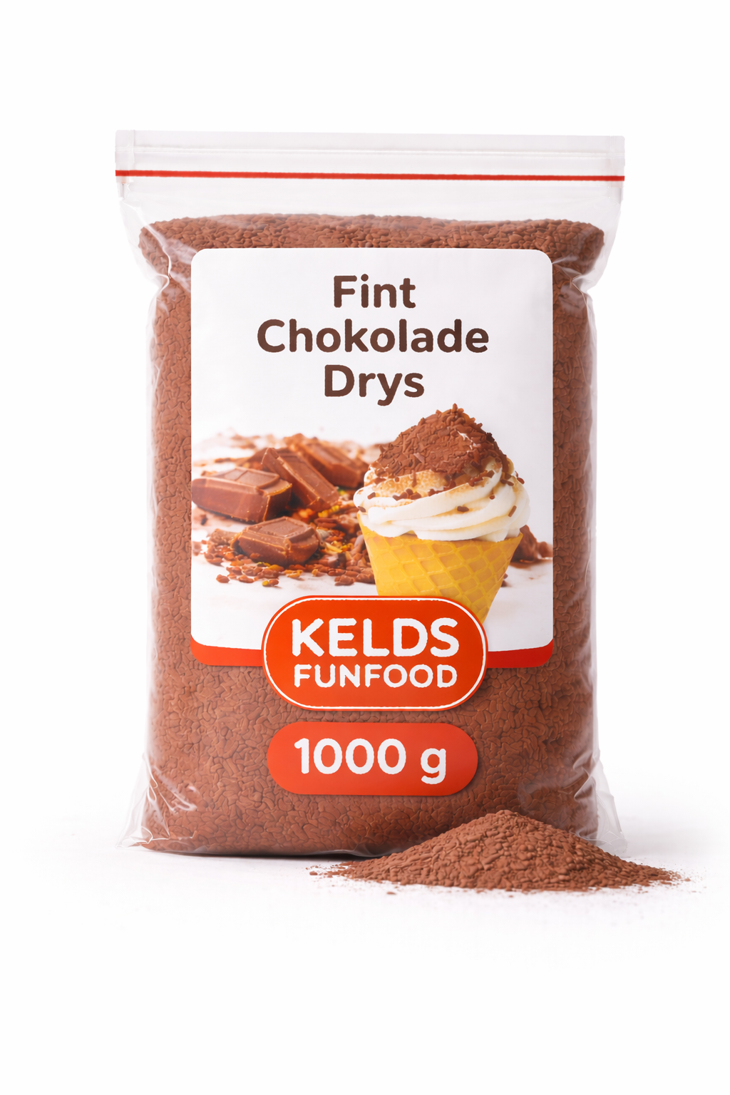 Fint Chokolade Drys består af små, sprøde chokoladeflager, der giver både smag og elegant udseende på softice, is, milkshakes eller desserter. Den rige chokoladesmag og fine tekstur gør krymmellet populært hos både børn og voksne, og det tilføjer et lækkert finish til enhver dessert.